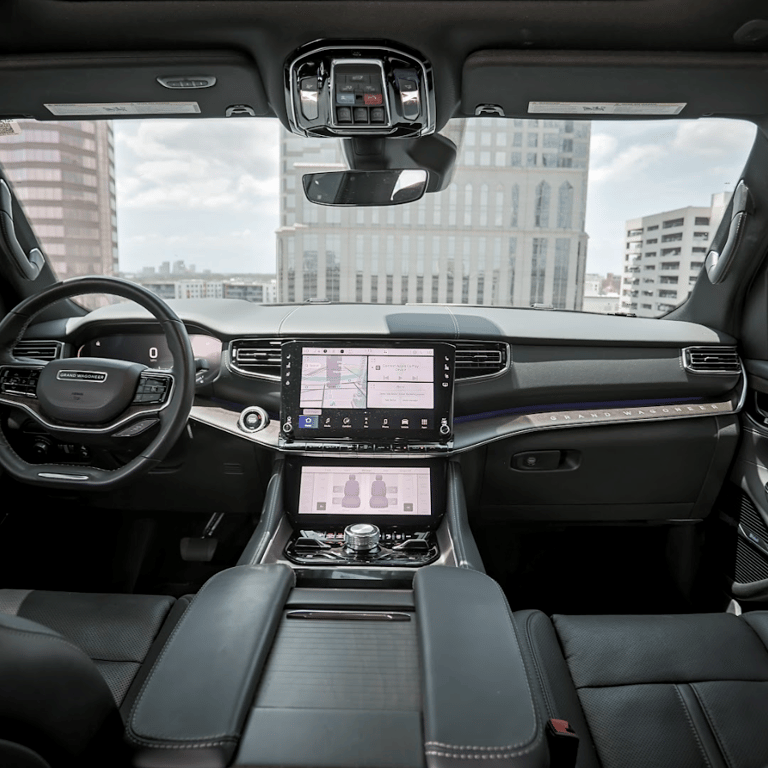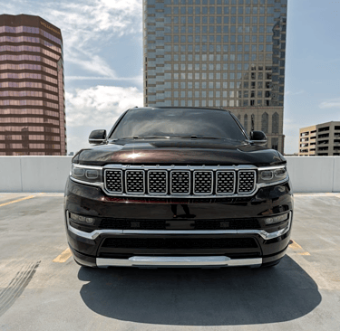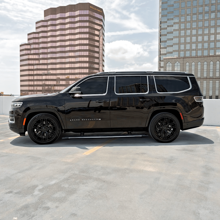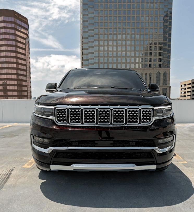 The Grand Wagoneer shown is a bold, full-size luxury SUV in glossy black. It features a commanding grille, sleek LED headlights, large black alloy wheels, and a refined, boxy silhouette that blends power with sophistication.