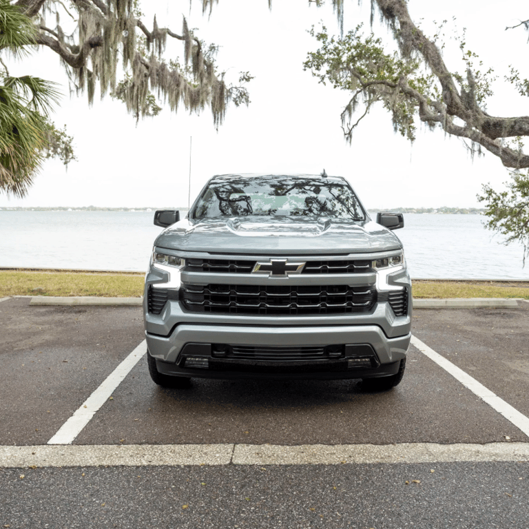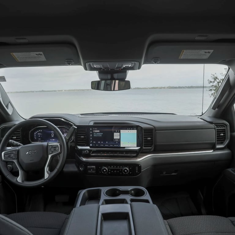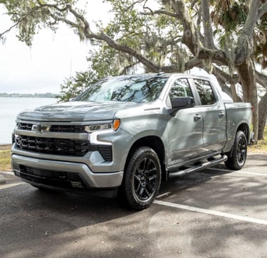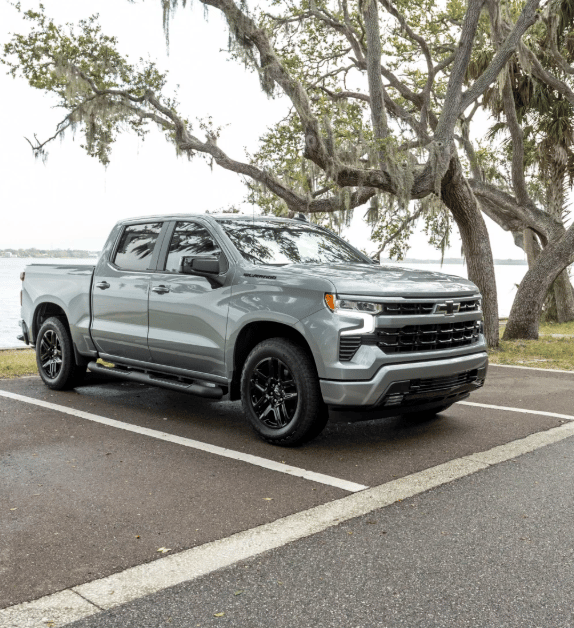 The Chevrolet Silverado shown is a bold red full-size pickup truck with a strong and modern design. It features a wide black grille, sleek LED headlights, black alloy wheels, and a muscular body that emphasizes power and capability.