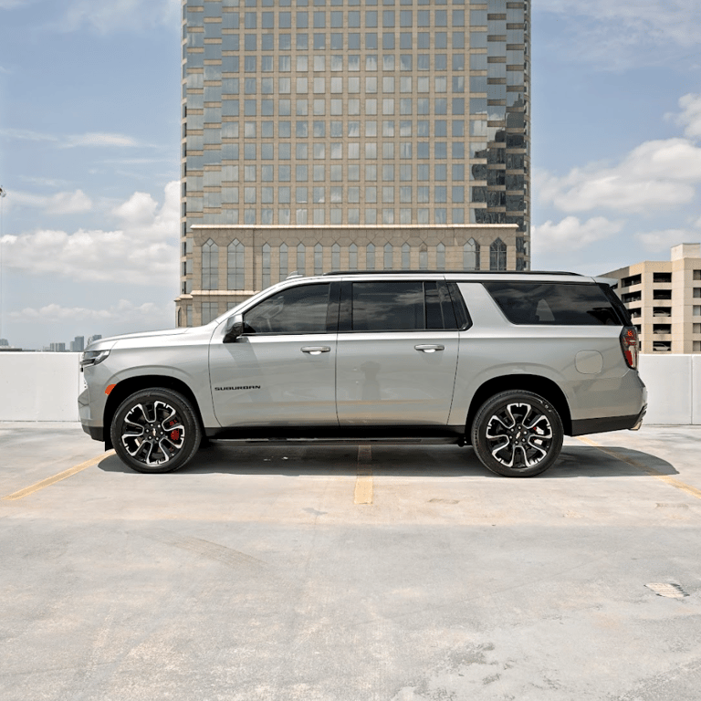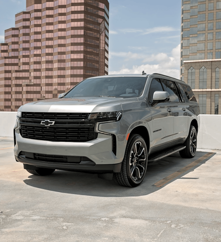 The Chevrolet Suburban shown is a large gray SUV with a bold, modern design. It features a wide grille, black accents, large alloy wheels, and a long, sleek body that emphasizes luxury, space, and presence.