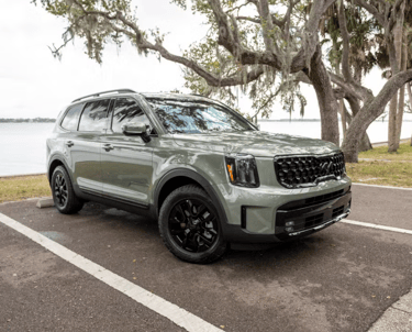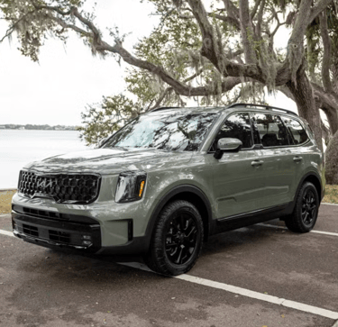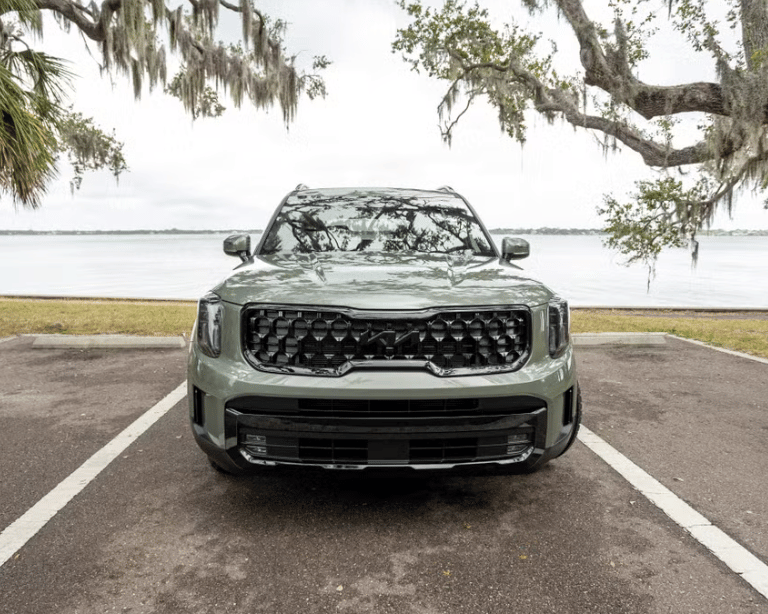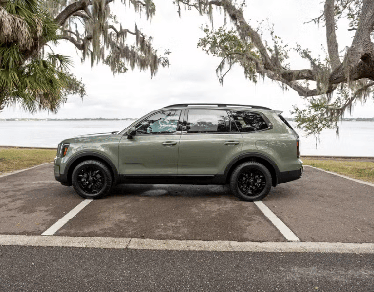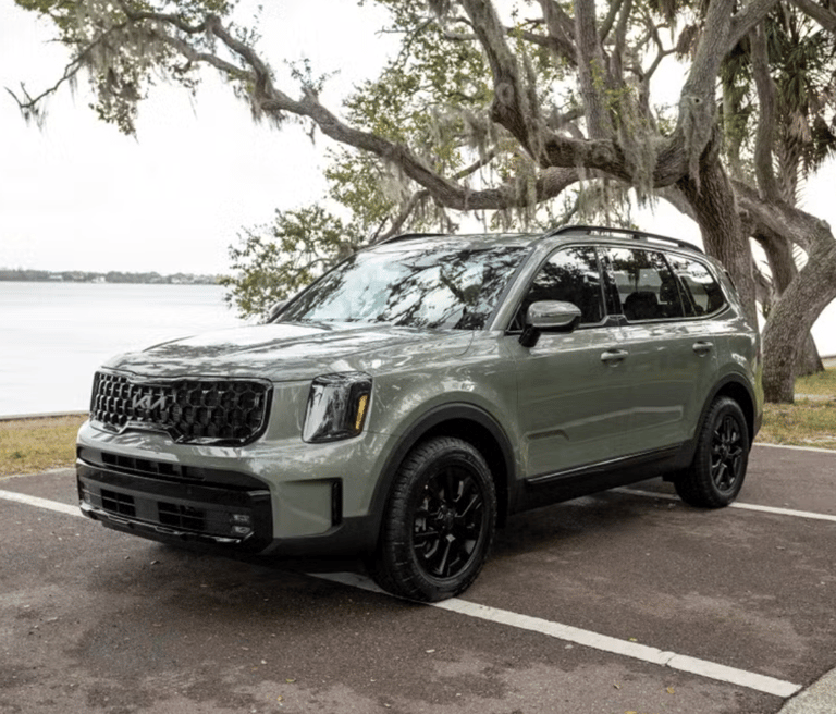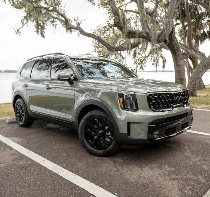 The SUV is a bold, rugged vehicle finished in a muted green. It features a boxy, upscale stance, a blacked-out grille, vertical LED headlights, and black alloy wheels. Subtle body lines and roof rails give it a modern, adventure-ready look while maintaining a refined presence.
