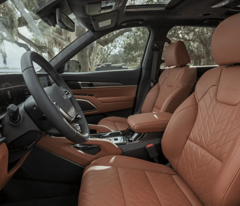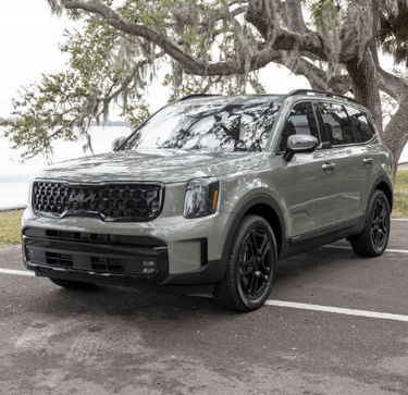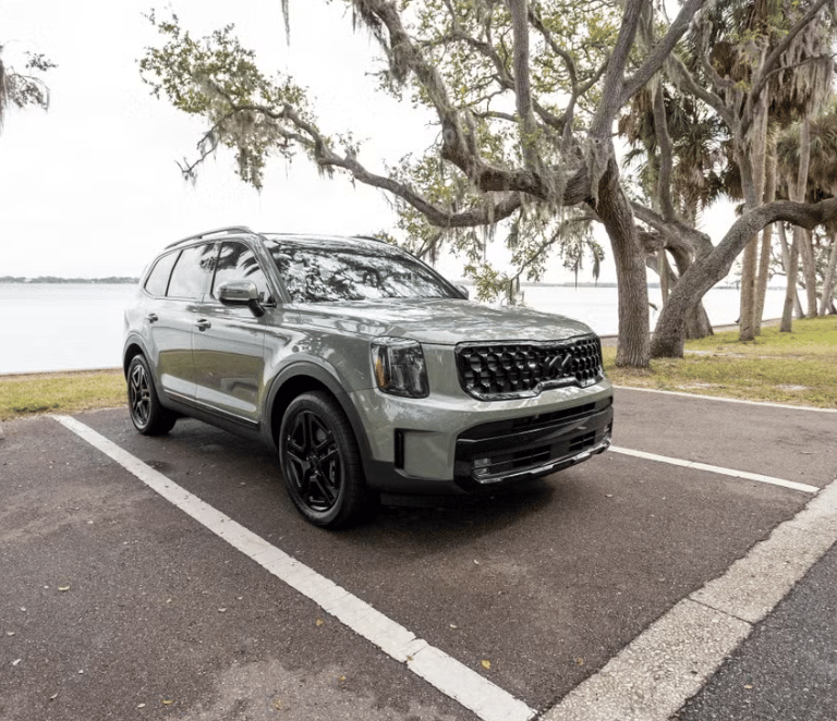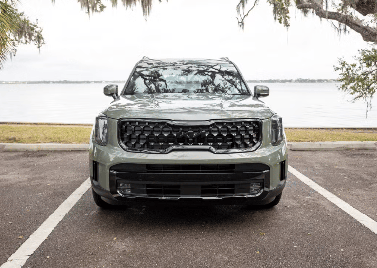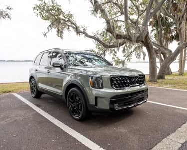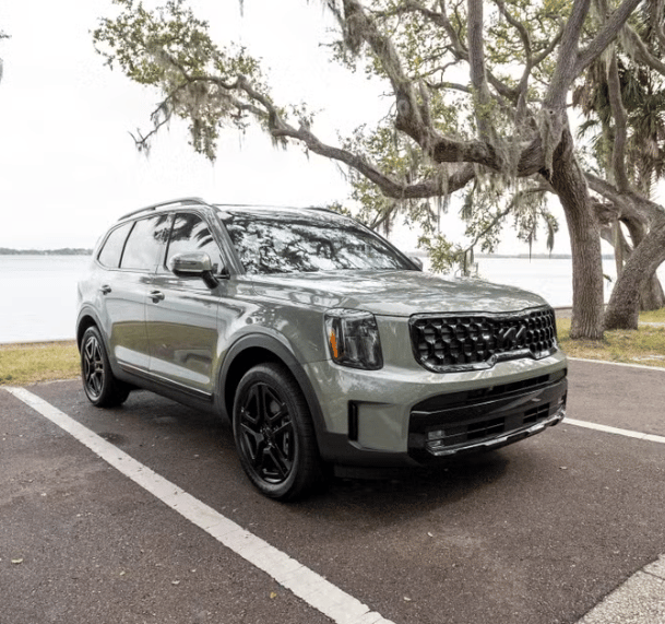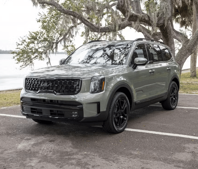 The SUV is a bold, rugged vehicle finished in a muted green. It features a boxy, upscale stance, a blacked-out grille, vertical LED headlights, and black alloy wheels. Subtle body lines and roof rails give it a modern, adventure-ready look while maintaining a refined presence.