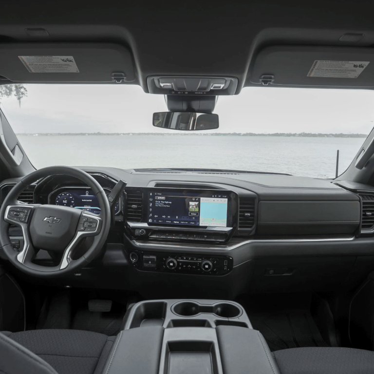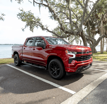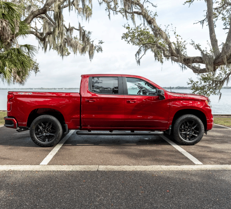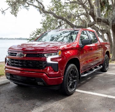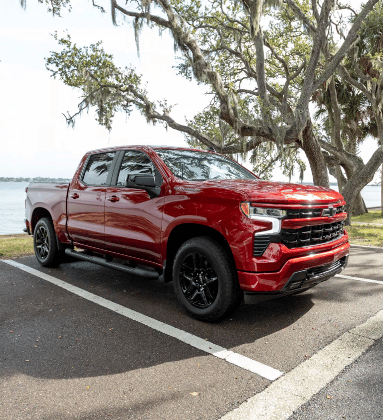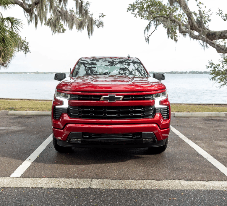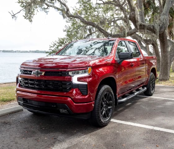 The Chevrolet Silverado shown is a bold red full-size pickup truck with a strong and modern design. It features a wide black grille, sleek LED headlights, black alloy wheels, and a muscular body that emphasizes power and capability.