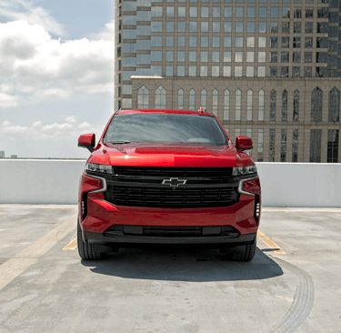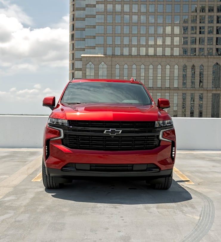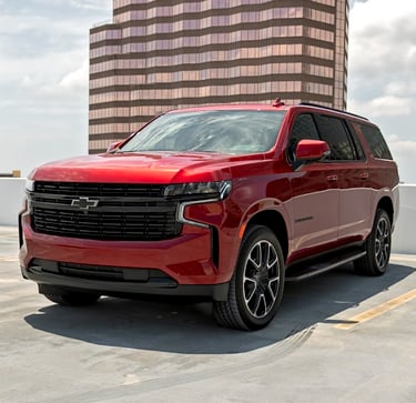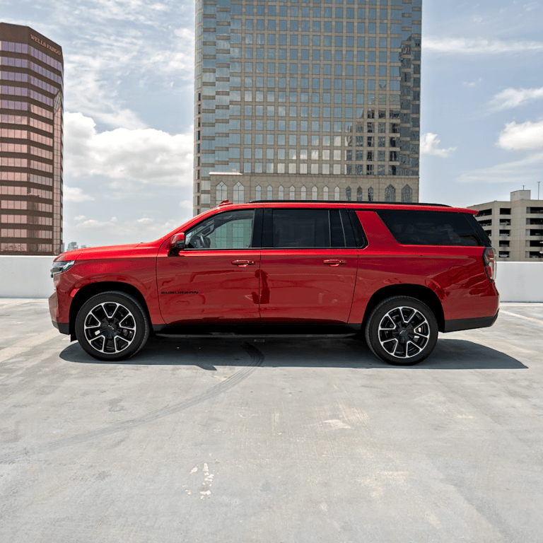 The Chevrolet Suburban shown is a bold red full-size SUV with a commanding presence. It features a wide black grille, sleek LED headlights, large alloy wheels, and a long, muscular body that blends power with modern style.